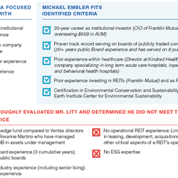 Our most recent Board refreshment process, driven by a clear set of criteria based on Ventas’s current and future needs and conducted with the assistance of Korn Ferry, featured consideration of more than 20 candidates, with six candidates reaching the Board-managed interview stage. Land & Buildings’ candidate, Mr. Litt, was interviewed by the Board as part of this process. Ultimately, the Ventas Board appointed Mr. Embler to the Board. Mr. Embler is the former Chief Investment Officer of Franklin Mutual Advisers, current director of American Airlines, and former director of Kindred Healthcare (one of Ventas’s largest tenants that specializes in long term acute care hospitals and other healthcare facilities, now known as Scion Health).